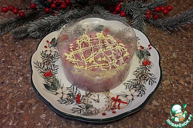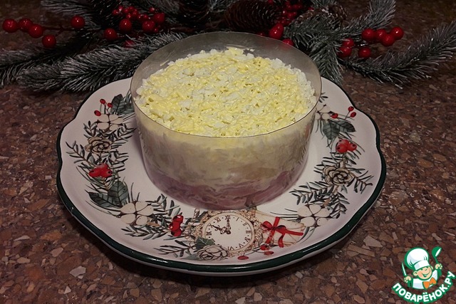 • Ставим кольцо на тарелку для подачи (у меня из пластиковой бутылки) и собираем салат.