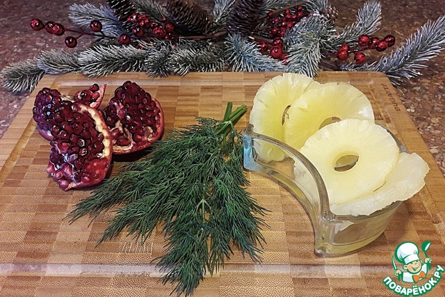 8 слой - кольца ананаса, веточки укропа и грозди граната.