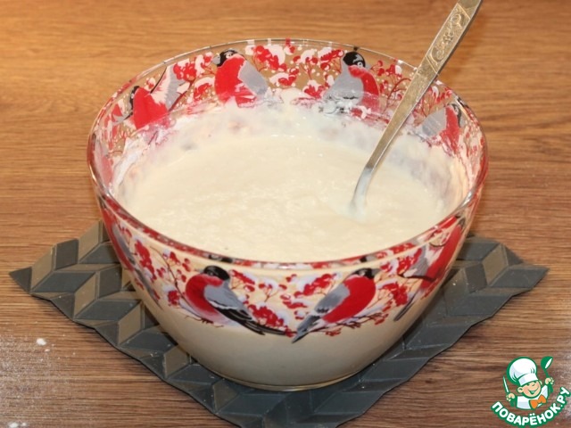 3. Небольшими порциями подсыпаем муку и перемешиваем тесто ложкой, а затем венчиком. В конце наливаем в тесто растительное масло (1 ст. л.). Тесто готово! Закрываем миску с тестом пленкой и ставим в сторону.