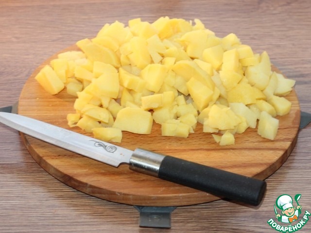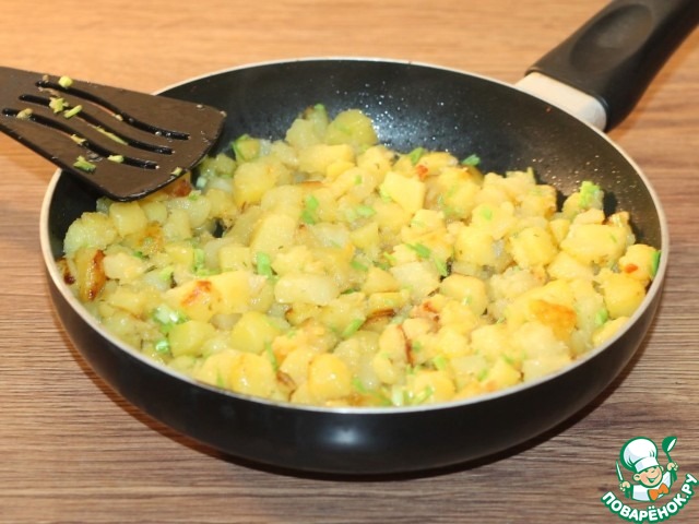13. Вареный картофель посыпаем приправой для овощей, солим и обжариваем на растительном масле, минут 8. Снимаем сковороду с плиты, и посыпаем картофель измельченным зеленым луком (у меня зеленый чеснок). Начинка готова!
