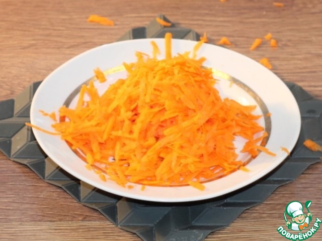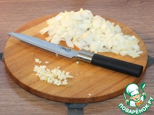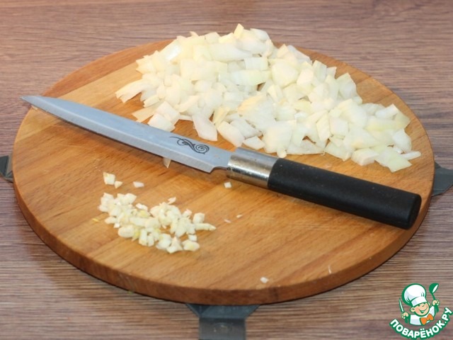 10. На разогретом растительном масле (2 ст. л.) обжариваем репчатый лук (3 мин.). Добавляем чеснок, жарим до появления аромата, минуты 2. Затем выкладываем морковь и пассеруем минуты 3.