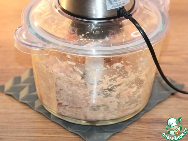 9. В чашу блендера кладем кусочки индейки, 0,5 часть лука, приправу для мяса 0,5 ч. л., солим и перчим. Измельчаем продукты блендером.