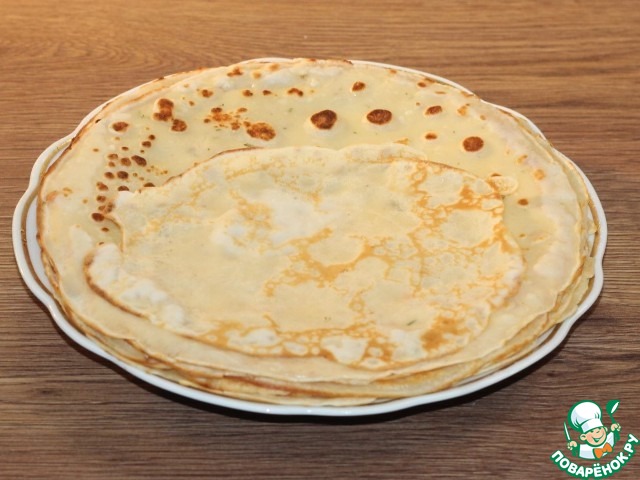 14. Разогреваем сковороду для выпечки блинов. Смазываем ее маслом. Половником набираем блинное тесто и распределяем его по поверхности сковороды. Жарим тонкие блинчики до румяности с двух сторон. Готовые блины складываем стопкой и накрываем крышкой.