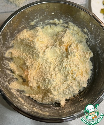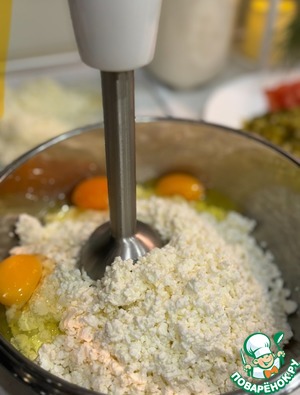 Готовим тесто: творог соединить с яйцами, посолить, добавить разрыхлитель для теста. Все пробить блендером до пастообразной массы