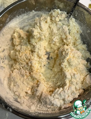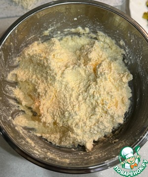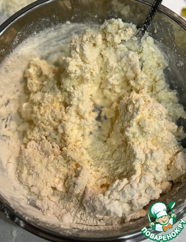 Добавить муку. Замесить тесто. Оно не должно быть жидким. Тесто будет липнуть к рукам. Не пугаемся - работаем с тестом руками, смоченными водой