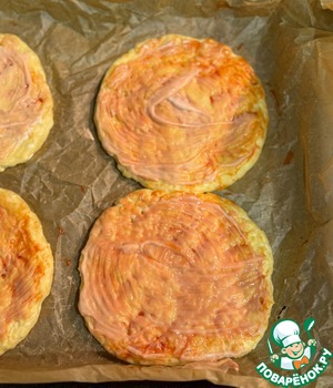 Мокрыми руками сформировать из каждого шарика основу для пиццы, как показано на фото
