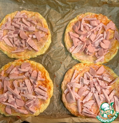 Сверху на каждую основу выложить измельченные ветчину и сосиски