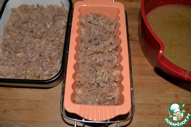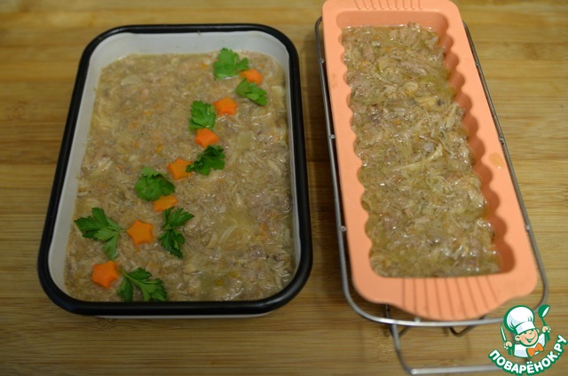 Заливаем мясо, процеженным бульоном. Даём холодцу остыть на столе, далее ставим в холодильник для полного застывания минимум на 6 часов, лучше на ночь. Ни в коем случае не даём холодцу замёрзнуть.