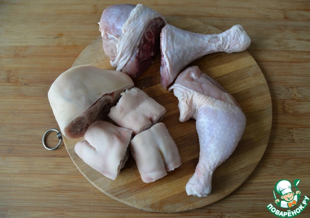 Берём куриный окорочок, голень индейки и свиную ножку (копыто). Я покупала уже распиленную свиную ножку, поэтому в ней части от разных ног. Тщательно промываем, очищаем все виды мяса, чтобы не оставалось перьев, и других "ненужностей".