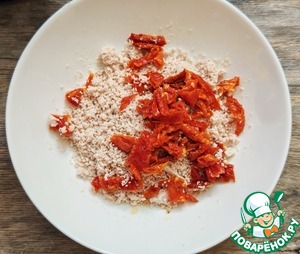 Часть измельченной индейки, примерно 1/3 часть, отложить для украшения. Остальную индейку смешать с нарезанными вялеными томатами.