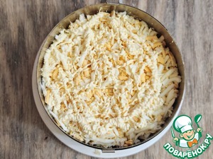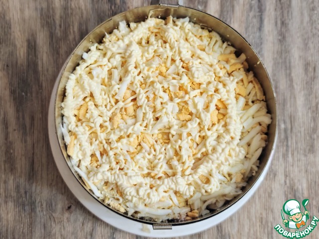 Далее натереть варёные яйца на мелкой терке, нанести сеточку из майонеза.