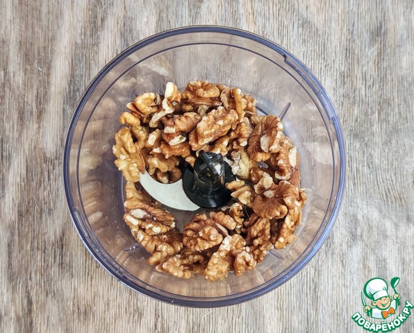 Грецкие орехи поместить в блендер, измельчить.