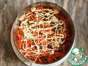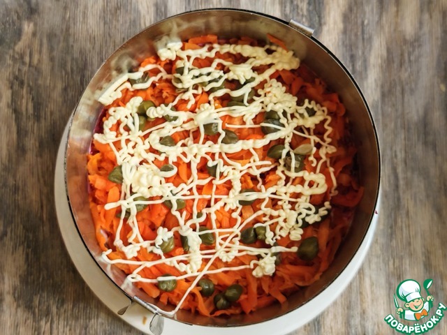 Варёную морковку натереть на мелкой терке, добавить каперсы, перемешать, распределить поверх свеклы, нанести сеточку из майонеза.