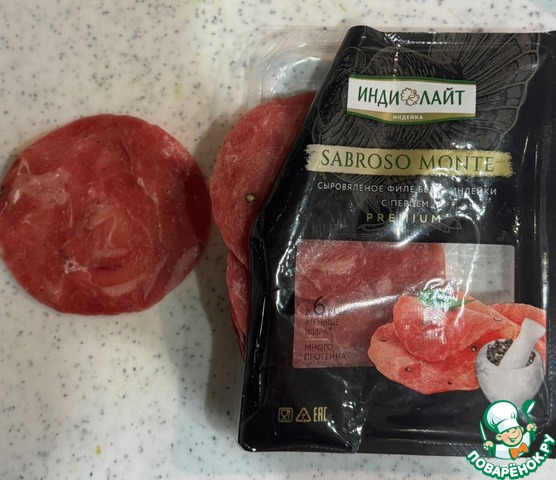- Индейка (Сыровяленое филе бедра индейки с перцем ТМ Индилайт) — 6 ломт.