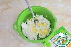 Отварные яйца очистите от скорлупы, выложите в чашу и разомните вилкой. Добавьте мягкий творожный сыр. Смешайте.