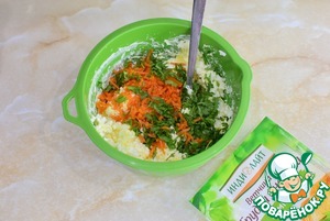 Следом добавьте мелко нарезанную морковь по-корейски и измельченную зелень. Пропустите через пресс пару зубчиков чеснока. По вкусу можно добавить соль и специи. Все ингредиенты смешайте между собой.