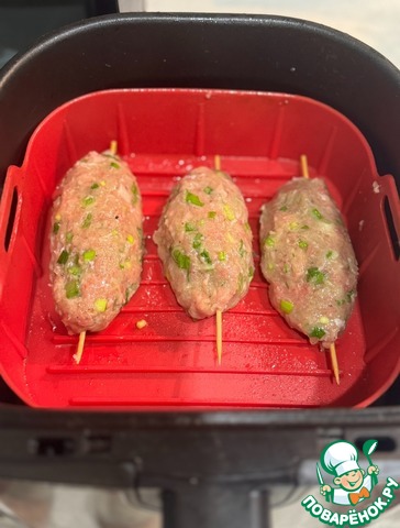 Выложить кебабы в форму для запекания и отправить готовиться в аэрогриль на 15-17 минут при температуре 180 градусов
