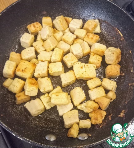Нарезать куриную грудку на кусочки. На растительном масле обжаривать кусочки курицы 7 минут.
