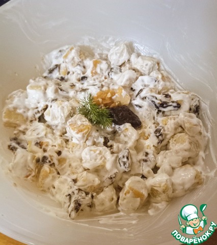 ананас, чернослив,...орехи какие-то, то ли авакадо, то ли картошка... ну сметана или майонез