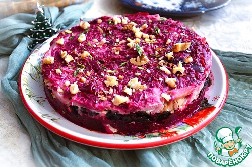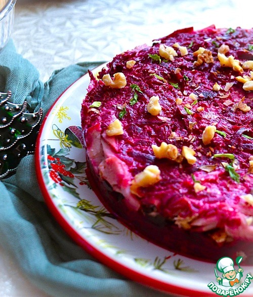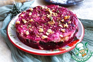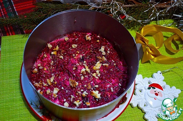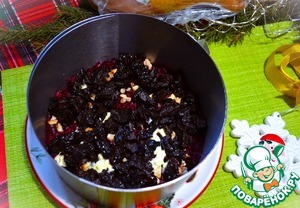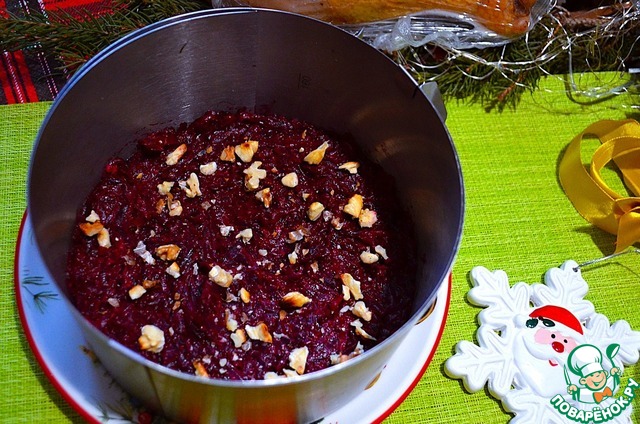 Сверху выложить остатки свёклы и орехи, уплотнить и убрать в холодильник на 2-4 часа.