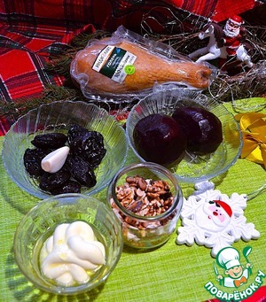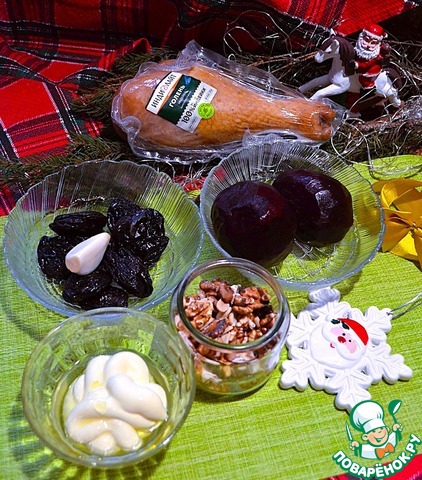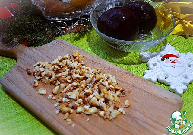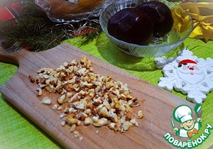 Приготовить продукты. Свёклу заранее запечь и остудить. Орехи обжарить.