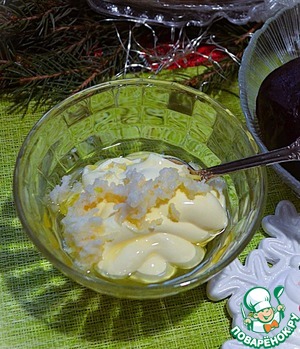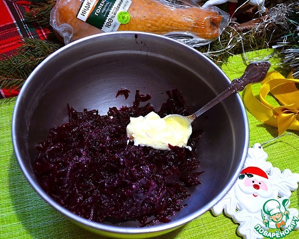 Свёклу натереть на терке, слегка отжать, посолить и смешать с 1 ч. л. соуса.