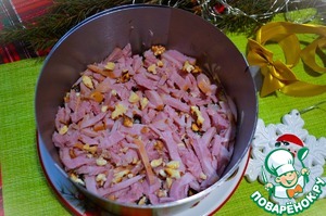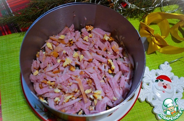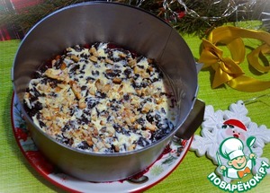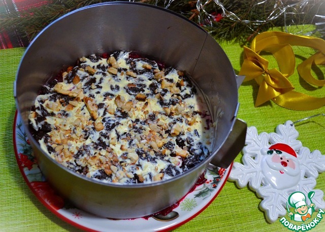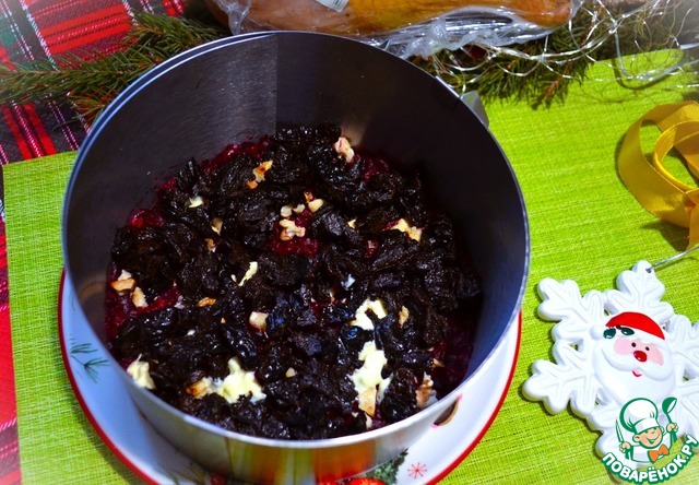 Чернослив нарезать, выложить следующим слоем.