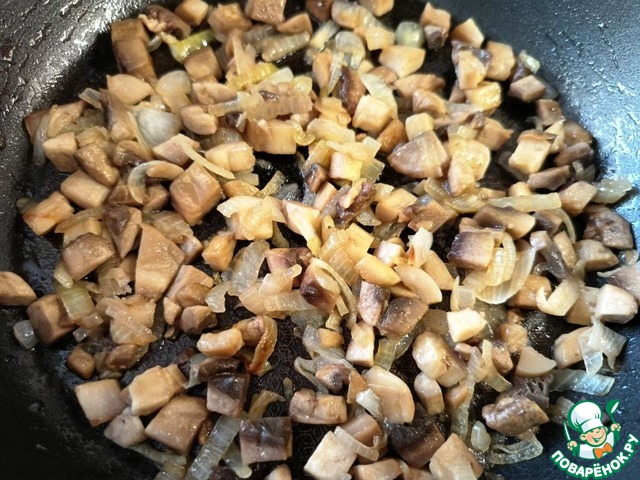 Шампиньоны обжарить с луком на растительном масле до золотистого цвета.