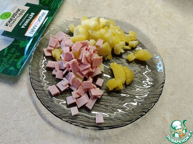 Нарезать вареный картофель и ветчину кубиками.