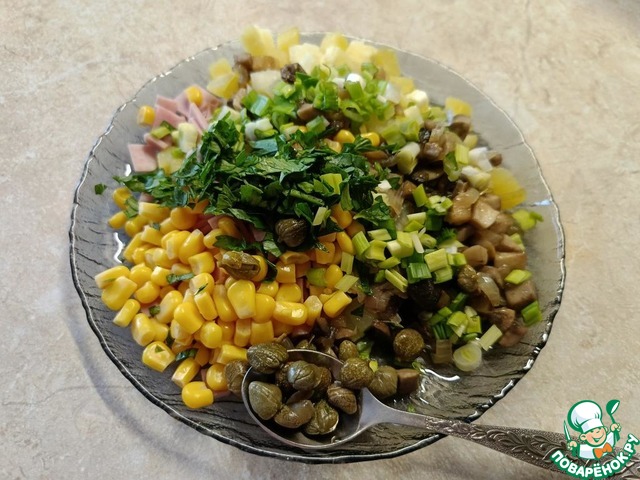 Добавить шампиньоны, кукурузу, каперсы и мелко нарезанный зелёный лук с петрушкой.