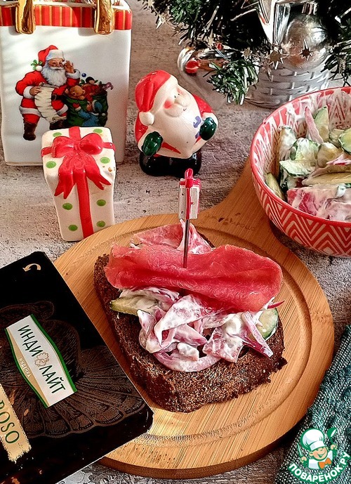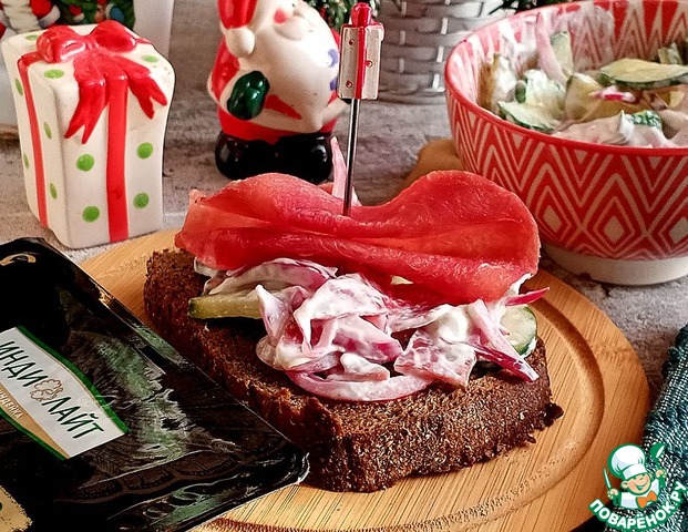 Салат можно подать в салатнике или на ломтиках Бородинского хлеба, украсив их сыровяленым филе из индейки.