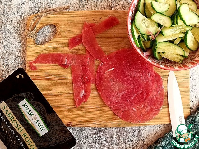 Рецепт «Огуречный салат с сыровяленой индейкой»: