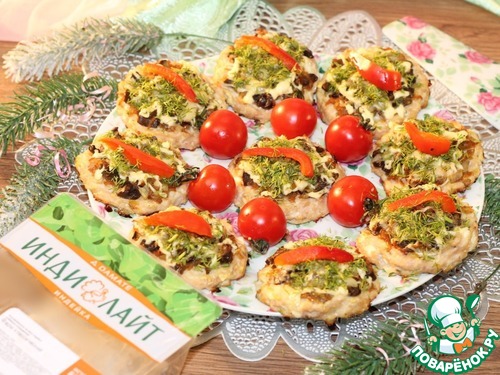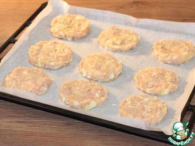 16. На заготовки кладем грибную начинку. Отправляем противень с котлетками в разогретую до 180 С духовку на 25 минут или до готовности котлет.