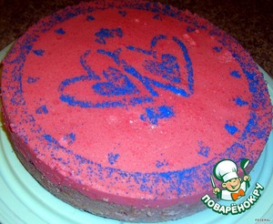 желатин предварительно замочить в 100мл. воды, потом подогреть и добавить в мусс, перемешать, добавить кусочки бисквита и поставить в холодильник на минут 10, чтобы немного остыл, потом ставим кольцо от разъёмной формы на блюдо, в середину кладём бисквитную массу, ставим в холодильник для застывания.