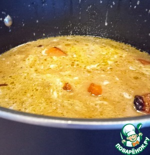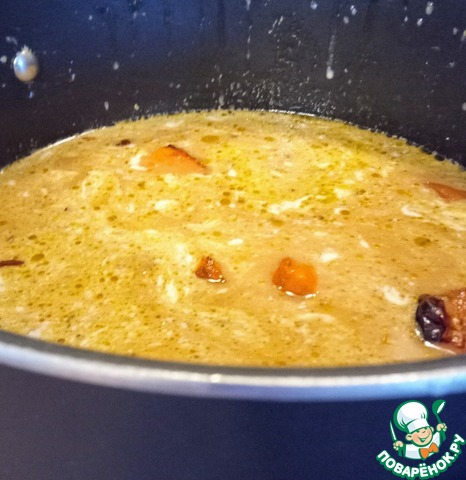 В кастрюлю добавить соевый соус, кокосовое молоко, жаренную морковь, тофу и 850мл воды. Довести до кипения, уменьшить огонь и тушить под крышкой 8 минут.