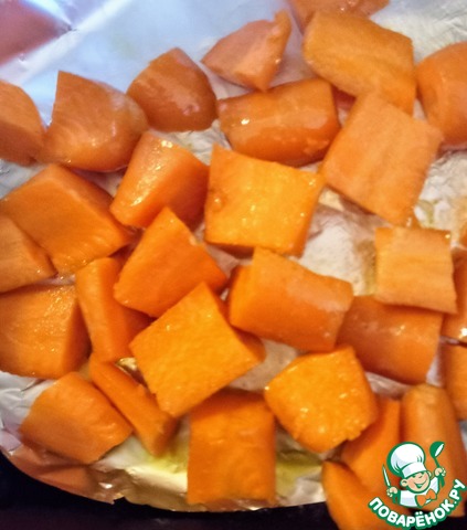 Разрезать морковь вдоль наполовину и, затем, нарезать на кусочки по 3см каждый. Выложить в форму для запекания, добавить 2 столовых ложки масла и одну чайную ложку соли. Размешать, обвалять кусочки моркови в созданной смеси. Запекать морковь в духовке при 220С 40 минут.