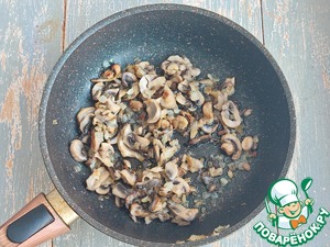 Лук почистить, нарезать произвольно, обжарить на растительном масле до прозрачности. Затем добавить консервированные грибы, предварительно, слив с них жидкость. Обжарить до выпаривания лишней жидкости.