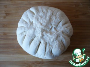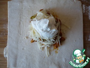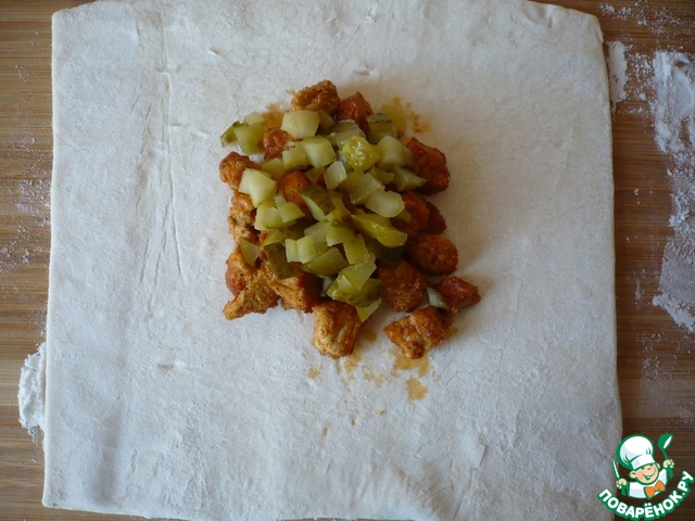 Рабочую поверхность присыпьте мукой и выложите на неё пласт размороженного слоеного теста, раскатать его в форме квадрата (у меня пласт размером 18х18 см, вы можете разрезать пласт теста на маленькие квадраты). В центр каждого пласта выложите обжаренное мясо грудки индейки (количество ингредиентов для начинки берите ориентировочно, смотрите по размеру пласта теста).