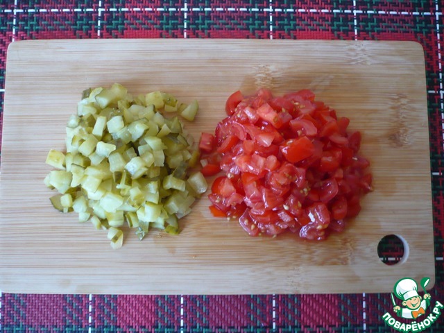 Выложите его сверху на маринованные огурцы, добавьте сметанный соус.