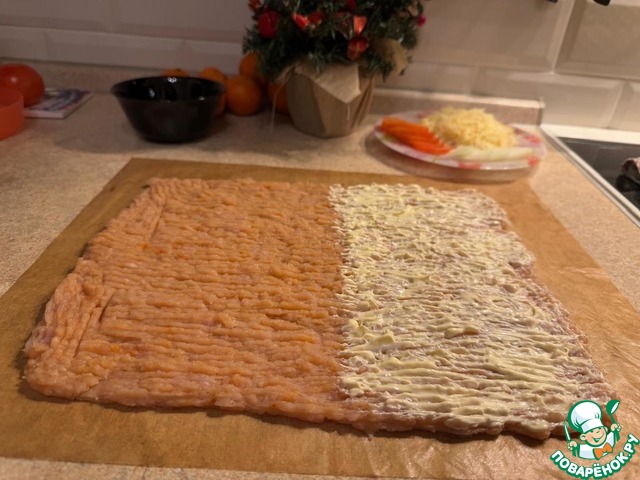 Получившийся фарш выложить на пергамент или силиконовый коврик. У меня многоразовый коврик-пергамент. Разровнять в виде прямоугольника - сначала ложкой, а потом вилкой.