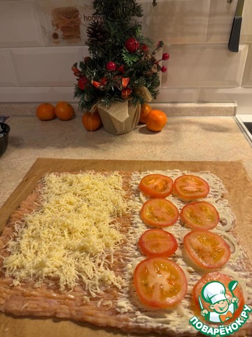 На другую сторону выложить сыр. Можно использовать грибы, творожный сыр, оливки, маринованные огурчики - все что любите. Один раз приготовите - поймете что это и уже в следующий раз поэкспериментируйте. -