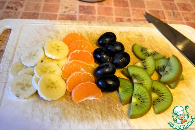 Для украшения нарезать бананы, киви, разобрать на дольки мандарин, очистить виноград.