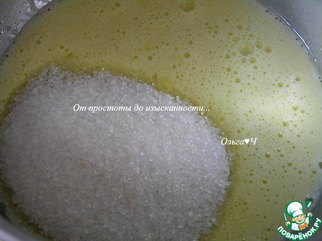 Для теста разделите яйца на белки и желтки. Белки взбейте с солью в крепкую пену и уберите в холодильник. В другой емкости немного взбейте желтки, затем добавьте сахар.