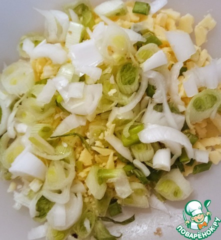 К сыру выложить мелко нарезанный зелёный лук и чеснок.