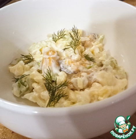 Полить майонезом. Тщательно перемешать. Посыпать укропом (по желанию). Можно подавать. Приятного аппетита.