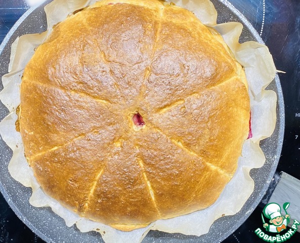Прикрыть им начинку, закрепить края, в серединке сделать ножом дырочку, обратной стороной ножа визуально разделить на порции, у меня получилось 8 штук, смазать молоком, поставить в духовку 200" 30-35 минут. Следите за свое техникой!