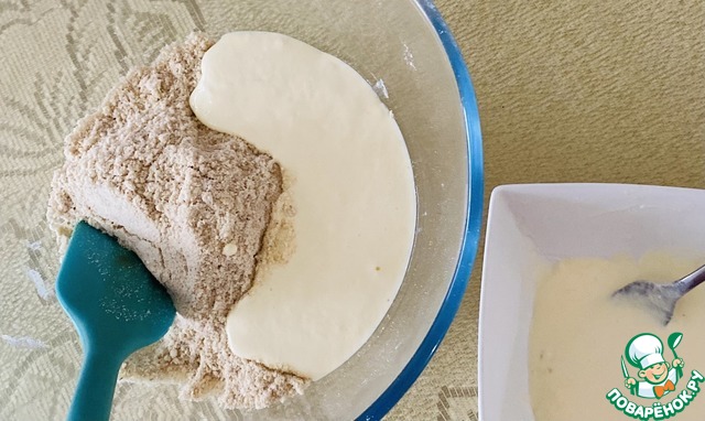 Просеять муку с солью, разрыхлителем, добавить отруби, сахар и перемешать -