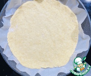 Одну часть раскатать в круг на пекарской бумаге, толщиной 1-1,5 см. так удобно перенести на сковороду d 24 см.