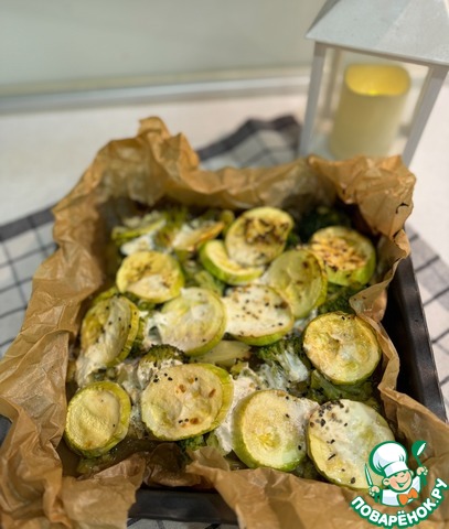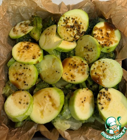 На филе рыбы выложить брокколи и кабачок, нарезанный кружочками. Сверху сбрызнуть оливковым маслом