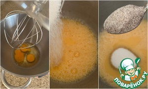 Три яйца … не то, чтобы взбил, а просто перемешал в чаше миксера, вот таким венчиком до пены. На маленькой скорости. Чтобы, повторюсь, не взбить, а именно только хорошо перемешать.
